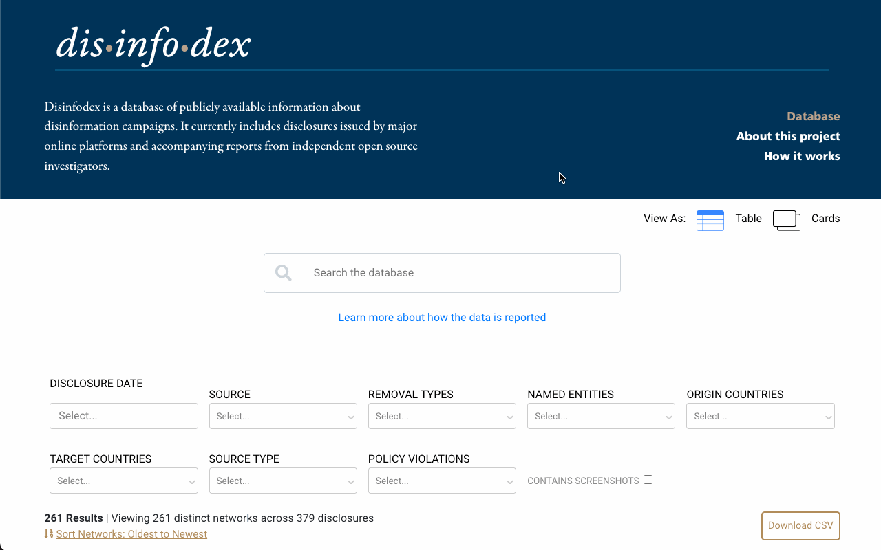 Disinformation takedown database for Harvard's Berkman Klein Center
