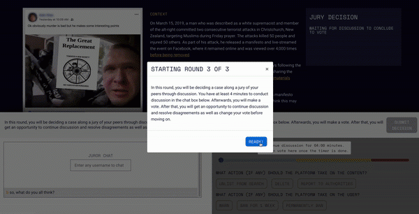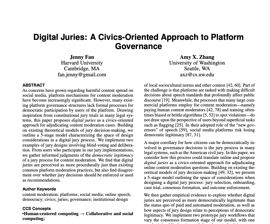 As concerns have grown regarding harmful content spread on social media, platform mechanisms for content moderation have become increasingly significant. However, many exist- ing platform governance structures lack formal processes for democratic participation by users of the platform. Drawing inspiration from constitutional jury trials in many legal systems, this paper proposes digital juries as a civics-oriented approach for adjudicating content moderation cases.