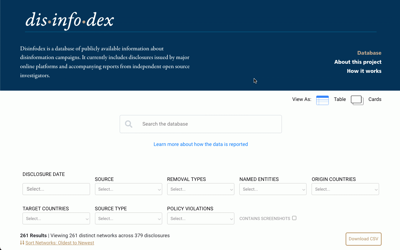 Social media platforms like Facebook, Twitter, Reddit, etc. regularly release public disclosures about content takedown related to disinformation campaigns, often related to state or international actors. With so many platform disclosures being self-reported by platforms and studied by third-party open source investigators (OSI), there was no centralized database of disclosures being maintained or managed.